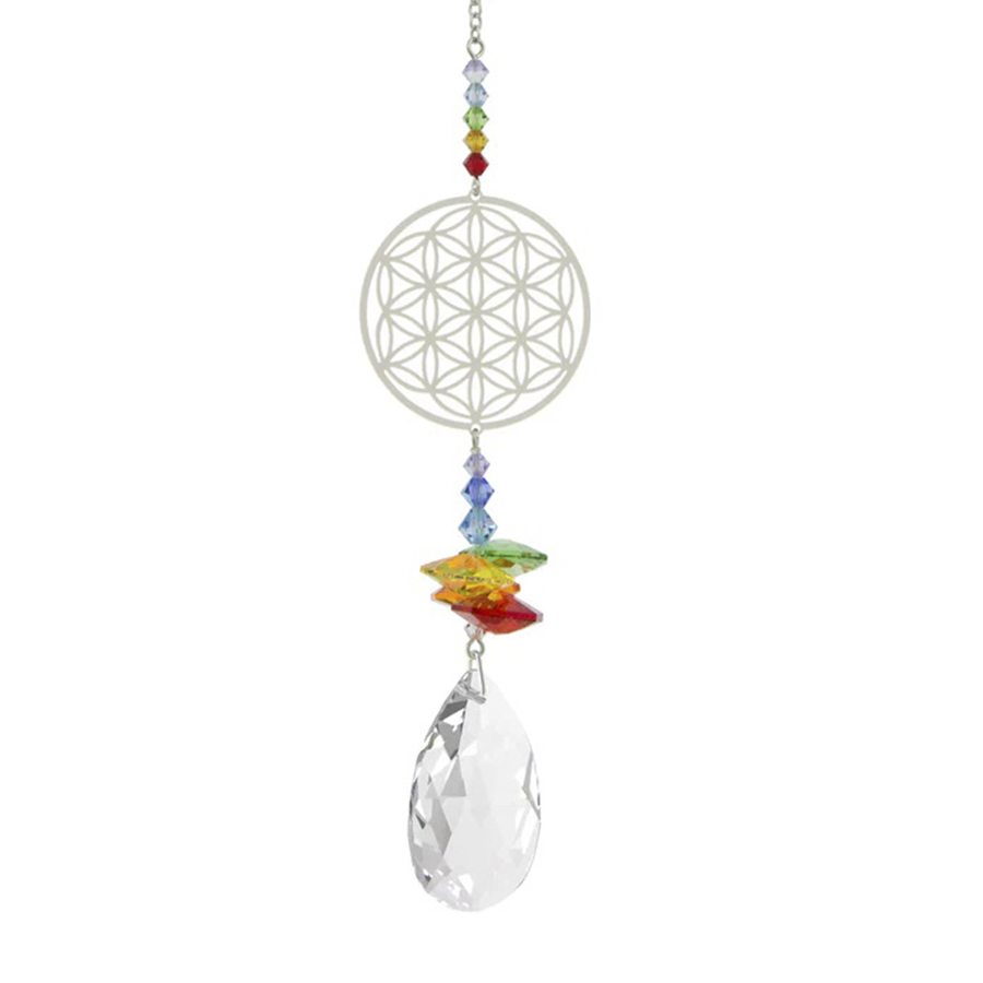 Según la geometría sagrada, la flor de la vida simboliza la creación y la interrelación entre todos los seres. Esa cascada de cristal permite activar la energía natural y equilibrarla para proporcionar armonía, felicidad y prosperidad en el hogar. Cuélgala junto a una ventana y cada vez que el sol brille, los cristales proyectarán múltiples arcoíris en las paredes de la habitación. Esta fantasía incorpora cristales de calidad y se remata con un colgante transparente para crear más arcoíris.. Cadena y silueta de metal. Almendra 38 mm. Longitud total 24 cm. Se sirve con bolsa de organza y ventosa.